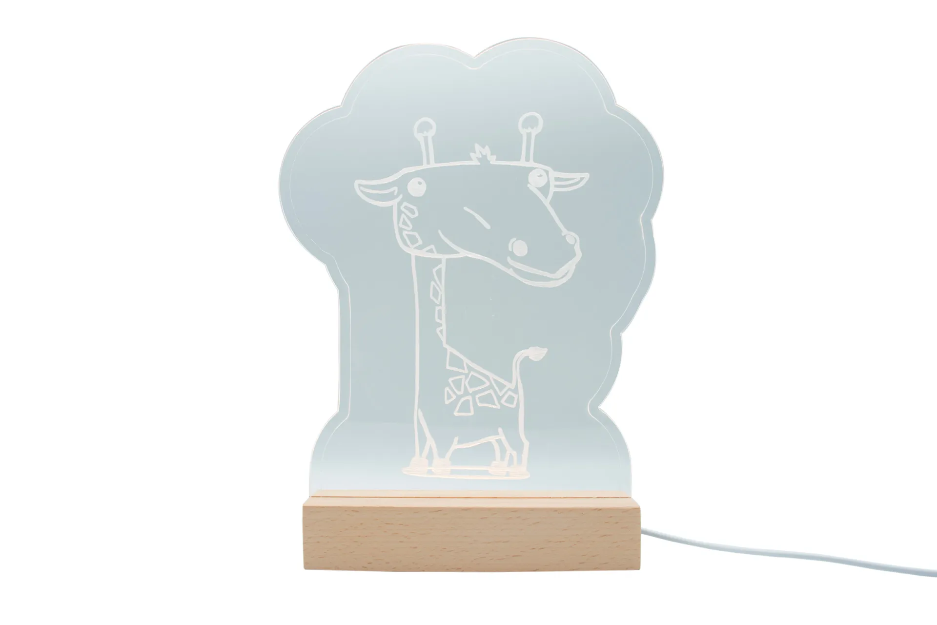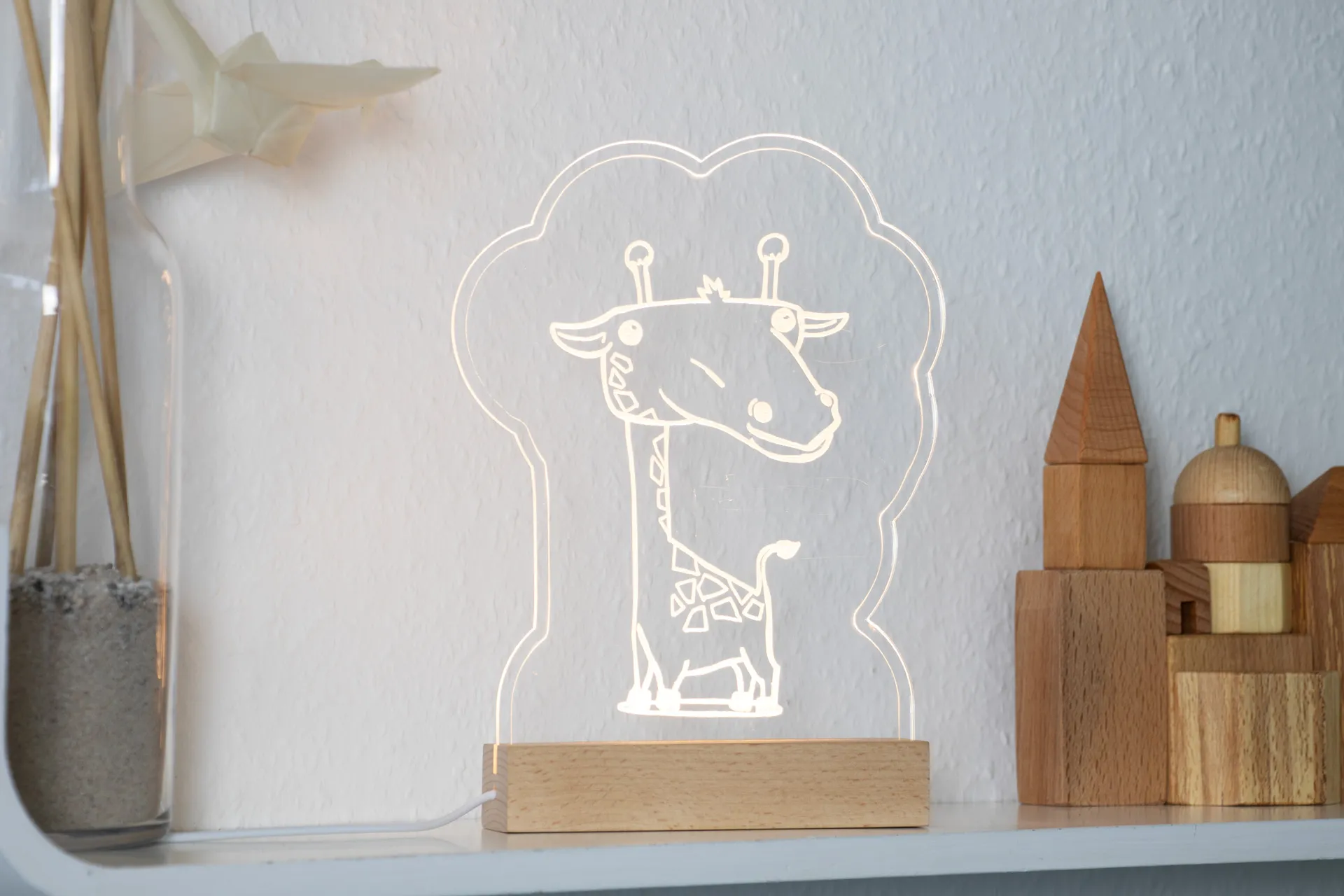 Was gibt es süßeres, als eine junge Giraffe, die ihre ersten Schritte macht und versucht, ihren Kopf oben zu halten. Vielleicht wird Ihnen und Ihren Kindern genau das aus Zoobesuchen in Erinnerung bleiben. Holen Sie sich dieses Gefühl nach Hause mit einem Aufsteller mit niedlichem Giraffenmotiv. Der Aufsteller kommt mit einem Holzsockel und einer integrierten LED-Leuchte. Lassen Sie per Knopfdruck das Motiv aufleuchten. So kann die kleine Giraffe Ihre Kinder vor der Dunkelheit schützen. Als zusätzliche Option können Sie außerdem einen Namen auf den Holzsockel gravieren lassen. Das perfekte Geschenk für tierbegeisterte Kinder.