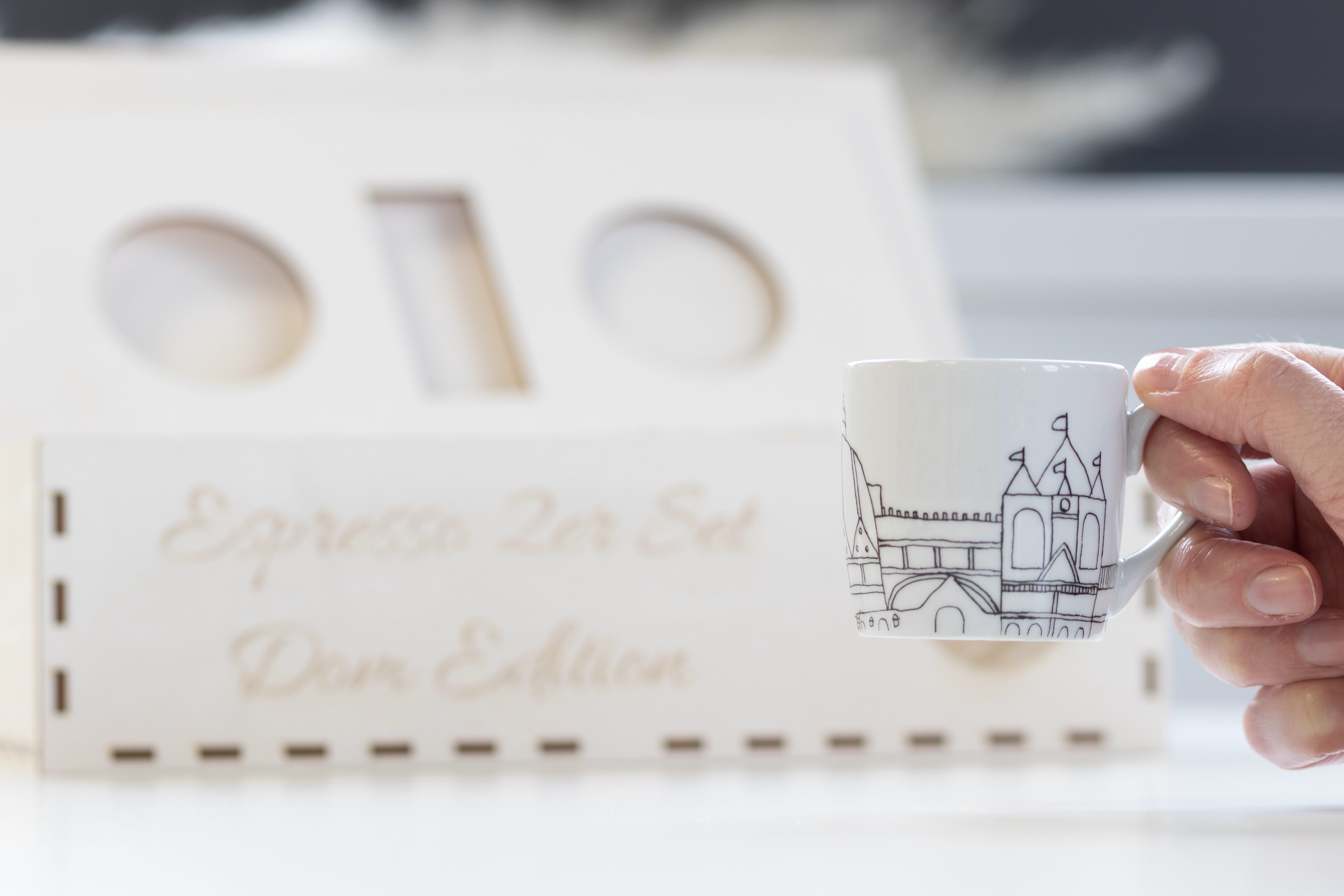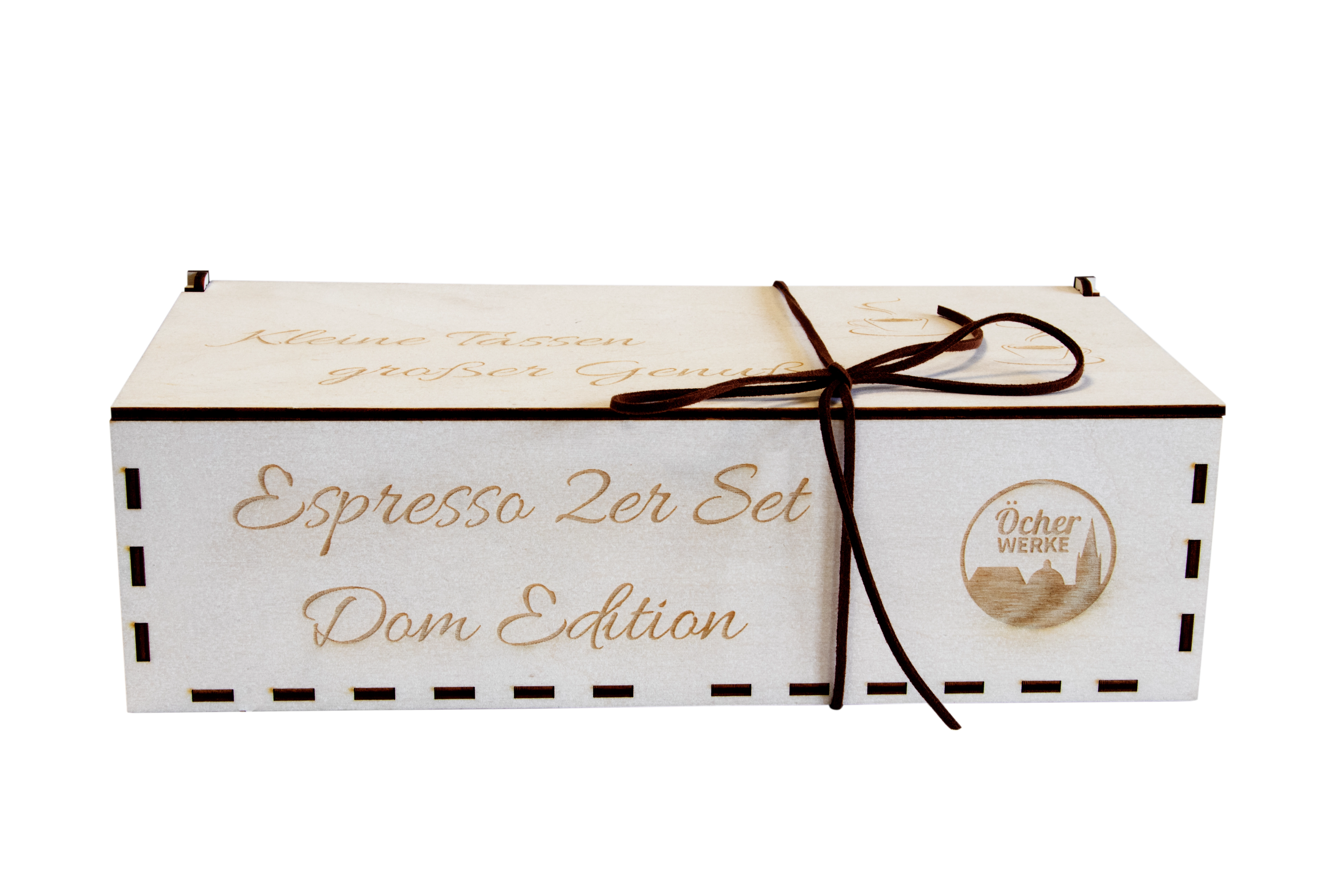 Jetzt einen Espresso. Der wunderbare Duft des frisch aufgebrühten Kaffees, der durch das Zimmer zieht. Was gibt es Schöneres? Unsere passenden Tassen in der Geschenkbox zum Beispiel! In Ihrem Set bekommen Sie zwei wunderbar bedruckte Espressotassen mit Untersetzern. Das Motiv auf den Tassen ist der Aachener Dom. Verpackt sind die Beiden in einer stabilen und wunderschön beschrifteten Holzbox, die wirklich ein Hingucker ist. So eignet sich das Set auch als tolles Geschenk für Espresso-Liebhaber. Die Box kommt in den Maßen B 27,3 cm, H 8 cm, T 13,7 cm.