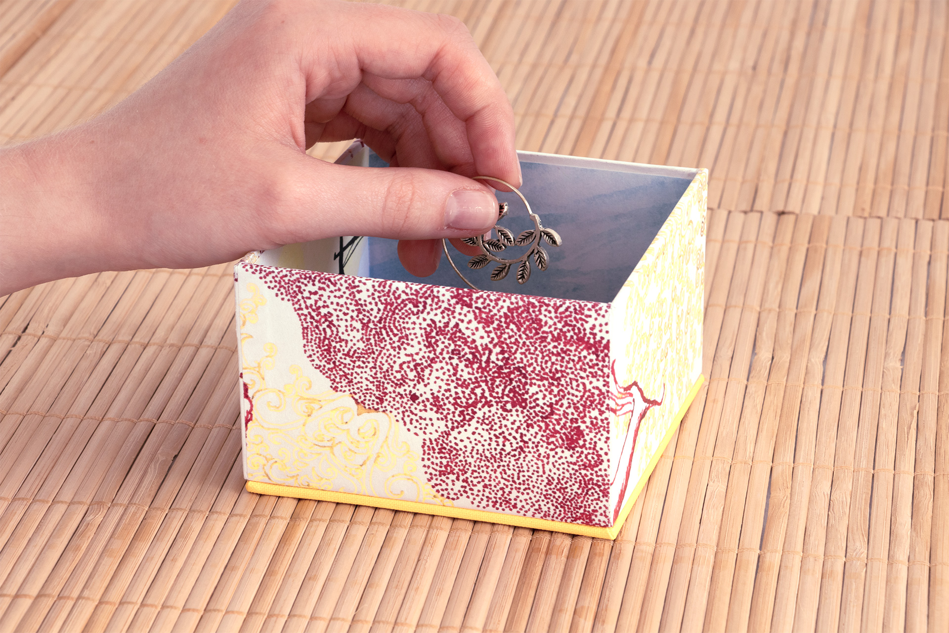 Geben Sie Ihrer Schmucksammlung ein Zuhause! Die Schmuckdosen im farbenfrohen Design bieten genug Platz für Ihre liebsten Stücke. Dazu können Sie aus drei Ausführungen wählen. Klein: B 9,7 cm, H 9,7 cm, T 6,6 cm, Mittel: B 11,4 cm, H 11,4 cm, T 7,4 cm und Groß: B 13,5 cm, H 13,5 cm, T 8,4 cm. Sie sehen, es ist für jede Sammlung etwas dabei. Die rechteckige Bauweise ist dabei schlicht aber elegant und äußerst robust. Der passgenau gefertigte Deckel sitzt perfekt, um Ihren Schmuck und weitere Gegenstände sicher zu verwahren, lässt sich aber komfortabel genug öffnen und schließen, damit sie ihren Schmuck im Handumdrehen an- oder ablegen können. Erfreuen Sie sich zudem an dem selbstgestalteten fungalen Design in warmen Rot- und Gelbtönen. Das handgemalte Muster setzt sich über die Seitenwände und den Deckel fort – so ist Ihre neue Schmuckdose in jedem Fall ein absoluter Hingucker und der ideale Platz für Ihre Ringe und Ketten.